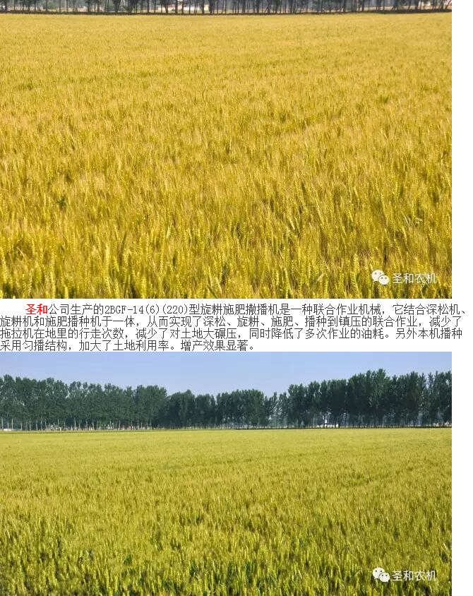 圣和公司生產的2BGF-14(6)(220)型旋耕施肥撒播機是一種聯合作業機械,它結合深松機、旋耕機和施肥播種機于一體,從而實現了深松、旋耕、施肥、播種到鎮壓的聯合作業,減少了拖拉機在地里的行走次數,減少了對土地大碾壓,同時降低了多次作業的油耗。另外本機播種采用勻播結構,加大了土地利用率。增產效果顯著。