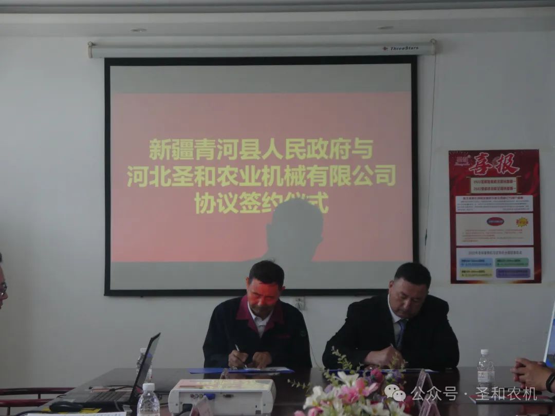 考察結束后,雙方團隊在圣和公司研發樓二樓會議室舉行了戰略合作框架協議簽署儀式。在簽約儀式上,努爾江·薩合塔穆拜主席代表新疆青河縣人民政府,王新芳董事長代表河北圣和農業機械有限公司簽署了戰略合作框架協議。宋強副書記與王新芳董事長均表示今后一定會精誠合作,實現共贏。